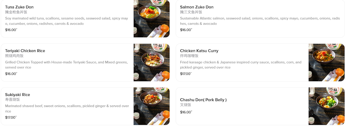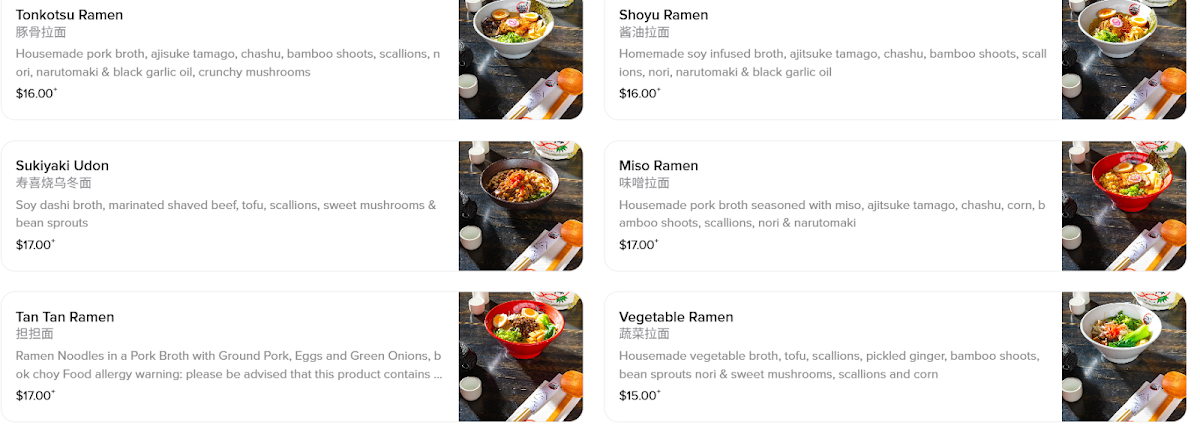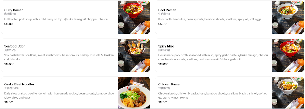 - Main Dishes: Ramen varieties, Tonkatsu, Udon, rice dishes, and specialty noodles