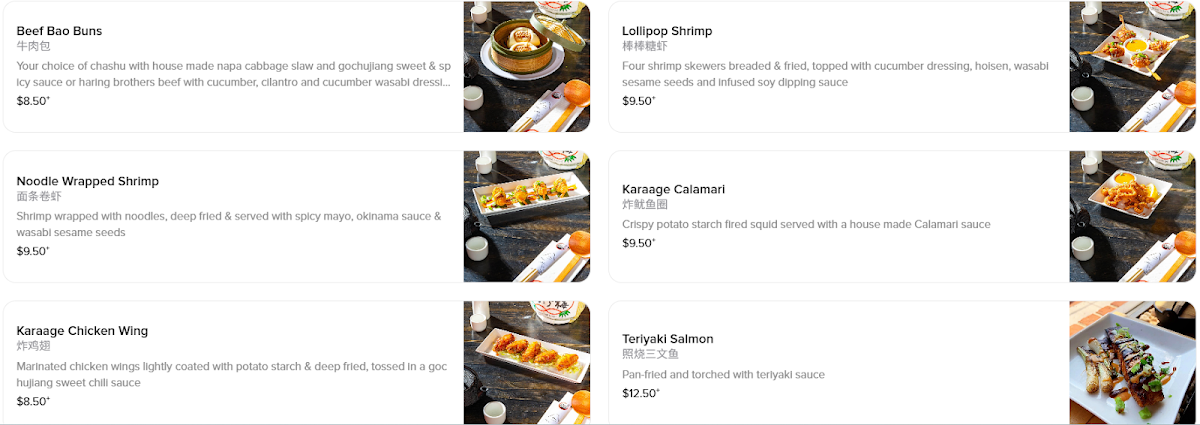 - Appetizers and Light Bites: Takoyaki, Chicken Wings, Lollipop Shrimp, Noodle Wrapped Shrimp