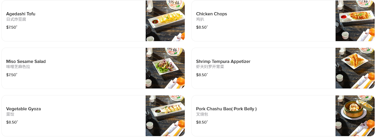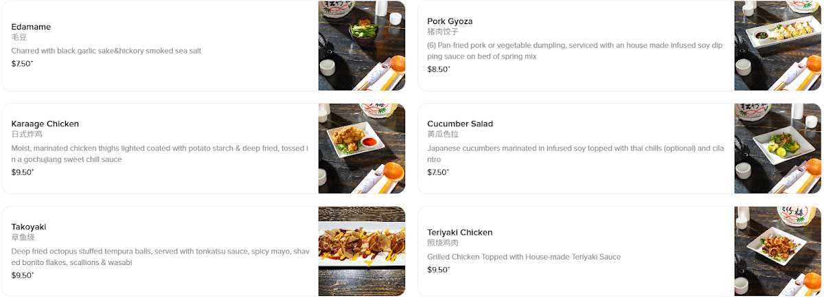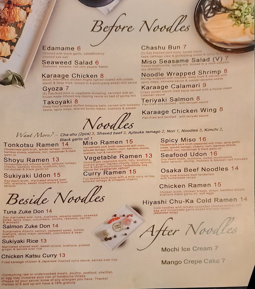 The menu caters well to casual dining with options suitable for both light meals and fuller dining experiences. It can accommodate varied tastes, from those seeking a quick bowl of ramen to guests interested in exploring a range of Japanese snacks and drinks.