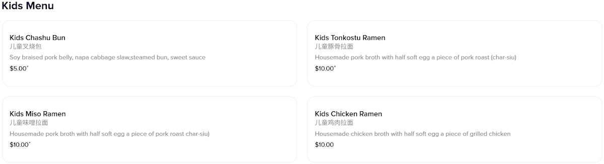 In addition to main dishes, the menu includes a range of appetizers and smaller plates like Chicken Wings and Lollipop Shrimp, suitable for light meals or sharing. For younger guests, there are kid-friendly options including Kids Tonkotsu Ramen and Kids Chashu Bun.